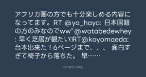 アフリカ圏の方でも十分楽しめる内容になってます。RT @ya_haya: 日本国籍の方のみなのでww”@watabedewhey: 早く芝居が観たい♪RT@koyomaeda: 台本出来た!6ページまで、、、 面白すぎて椅子から落ちた。 早く続きが読みたーい。”