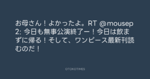 お母さん!よかったよ。RT @mousep2: 今日も無事公演終了ー!今日は飲まずに帰る!そして、ワンピース最新刊読むのだ!