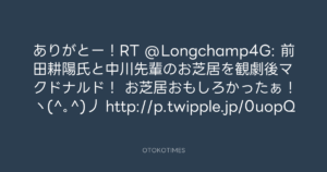 Koyo Maeda @koyomaeda – 16:33・2012年2月25日 2012 2/25 前田耕陽 2012-02-25 ありがとー!RT @Longchamp4G: 前田耕陽氏と中川先輩のお芝居を観劇後マクドナルド! お芝居おもしろかったぁ!ヽ(^。^)丿 http://p.twipple.jp/0uopQ Source:https://x.com/koyomaeda/status/173309665235574784 text X Post 前田耕陽 前田耕陽 この記事が気に入ったら フォローしてね! Follow @OtokoTimes1988 よかったらシェアしてね! URLをコピーしました! 寺岡呼人 @yohito_teraoka - 11:57・2012年2月25日 青山英樹 @aoyama_hideki - 22:24・2012年2月25日 関連記事 Artist 前田耕陽 1968.08.16