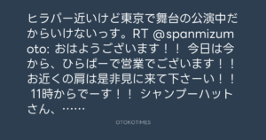 ヒラパー近いけど東京で舞台の公演中だからいけないっす。RT @spanmizumoto: おはようございます!! 今日は今から、ひらぱーで営業でございます!!お近くの肩は是非見に来て下さーい!! 11時からでーす!! シャンプーハットさん、笑い飯さん、南海キャンディーズさん、あべ