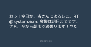 Koyo Maeda @koyomaeda – 22:29・2012年3月13日 2012 3/13 前田耕陽 2012-03-13 おっ!今日か、皆さんによろしこ。RT @systemzism: 金髪は明日までです。さぁ、今から朝まで頑張ります!やた Source:https://x.com/koyomaeda/status/179559726047174657 text X Post 前田耕陽 前田耕陽 この記事が気に入ったら フォローしてね! Follow @OtokoTimes1988 よかったらシェアしてね! URLをコピーしました! 寺岡呼人 @yohito_teraoka - 15:23・2012年3月13日 寺岡呼人 @yohito_teraoka - 9:46・2012年3月14日 関連記事 Artist 前田耕陽 1968.08.16