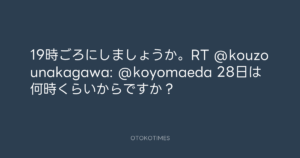 Koyo Maeda @koyomaeda – 13:16・2012年3月22日 2012 3/22 前田耕陽 2012-03-22 19時ごろにしましょうか。RT @kouzounakagawa: @koyomaeda 28日は何時くらいからですか? Source:https://x.com/koyomaeda/status/182682021276028928 text X Post 前田耕陽 前田耕陽 この記事が気に入ったら フォローしてね! Follow @OtokoTimes1988 よかったらシェアしてね! URLをコピーしました! 青山英樹 @aoyama_hideki - 12:57・2012年3月22日 寺岡 呼人 @yohitoteraoka - 14:14・2012年3月22日(IG post) 関連記事 Artist 前田耕陽 1968.08.16