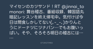 マイセンのカツサンド!RT @jinnai_tomonori: 舞台稽古、番組収録、韓国語丸暗記レッスンを終え帰宅中。気付けば今日は間食しかしてない(。-_-。)かりんとうにドーナツにツナパン…でもお腹いっぱい。そや、そろそろ明日の稽古には座長らしく、何か差し入れを買っていこう!