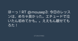 Koyo Maeda @koyomaeda – 9:11・2012年3月26日 2012 3/26 前田耕陽 2012-03-26 ほーっ!RT @mousep3: 今日のレッスンは、めちゃ良かった。エチュードで泣いたん初めてかも。。ええもん観せてもろた! Source:https://x.com/koyomaeda/status/184070137408790528 text X Post 前田耕陽 前田耕陽 この記事が気に入ったら フォローしてね! Follow @OtokoTimes1988 よかったらシェアしてね! URLをコピーしました! 青山英樹 @aoyama_hideki - 8:18・2012年3月26日 青山英樹 @aoyama_hideki - 9:19・2012年3月26日 関連記事 Artist 前田耕陽 1968.08.16