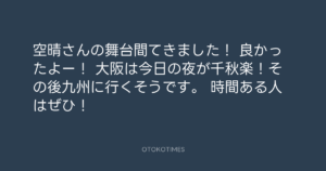 Koyo Maeda @koyomaeda – 15:48・2012年3月27日 2012 3/27 前田耕陽 2012-03-27 空晴さんの舞台間てきました! 良かったよー! 大阪は今日の夜が千秋楽!その後九州に行くそうです。 時間ある人はぜひ! Source:https://x.com/koyomaeda/status/184532279312400385 text X Post 前田耕陽 前田耕陽 この記事が気に入ったら フォローしてね! Follow @OtokoTimes1988 よかったらシェアしてね! URLをコピーしました! 青山英樹 @aoyama_hideki - 13:28・2012年3月27日 寺岡 呼人 @yohitoteraoka - 17:51・2012年3月27日(IG post) 関連記事 Artist 前田耕陽 1968.08.16