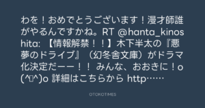 わを!おめでとうございます!漫才師誰がやるんですかね。RT @hanta_kinoshita: 【情報解禁!!】木下半太の『悪夢のドライブ』(幻冬舎文庫)がドラマ化決定だーー!! みんな、おおきに!o(^▽^)o 詳細はこちらから http://www.drama-insomnia.jp/