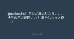 Koyo Maeda @koyomaeda – 23:18・2012年4月1日 2012 4/01 前田耕陽 2012-04-01 @dekachoh 自分が満足したら、、、 浩三の目の芝居いい! 舞台はもっと良い! Source:https://x.com/koyomaeda/status/186457565964681216 text X Post 前田耕陽 前田耕陽 この記事が気に入ったら フォローしてね! Follow @OtokoTimes1988 よかったらシェアしてね! URLをコピーしました! Koyo Maeda @koyomaeda - 15:39・2012年4月1日 Koyo Maeda @koyomaeda - 23:21・2012年4月1日 関連記事 Artist 前田耕陽 1968.08.16