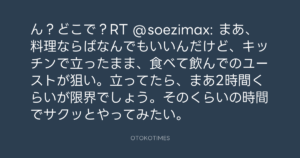 Koyo Maeda @koyomaeda – 18:37・2012年4月20日 2012 4/20 前田耕陽 2012-04-20 ん?どこで?RT @soezimax: まあ、料理ならばなんでもいいんだけど、キッチンで立ったまま、食べて飲んでのユーストが狙い。立ってたら、まあ2時間くらいが限界でしょう。そのくらいの時間でサクッとやってみたい。 Source:https://x.com/koyomaeda/status/193272110720892928 text X Post 前田耕陽 前田耕陽 この記事が気に入ったら フォローしてね! Follow @OtokoTimes1988 よかったらシェアしてね! URLをコピーしました! 寺岡呼人 @yohito_teraoka - 14:53・2012年4月20日 寺岡 呼人 @yohitoteraoka - 18:46・2012年4月20日(IG post) 関連記事 Artist 前田耕陽 1968.08.16
