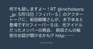 何でも話しますよ〜!RT @nicholsons_jp: 5月13日「フィバー5」のアフタートークに、前田耕陽さんが、木下半太と登場です!!!フィーバー5は、元アイドルだったメンバーの再会、 前田さんの秘密のお話が聞けるかも!? http://www.nicholsons.jp