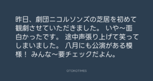 Koyo Maeda @koyomaeda – 0:16・2012年5月15日 2012 5/15 前田耕陽 2012-05-15 昨日、劇団ニコルソンズの芝居を初めて観劇させていただきました。 いや〜面白かったです。 途中声張り上げて笑ってしまいました。 八月にも公演がある模様! みんな〜要チェックだよん。 Source:https://x.com/koyomaeda/status/202054728841039872 text X Post 前田耕陽 前田耕陽 この記事が気に入ったら フォローしてね! Follow @OtokoTimes1988 よかったらシェアしてね! URLをコピーしました! Koyo Maeda @koyomaeda - 18:29・2012年5月14日 青山英樹 @aoyama_hideki - 13:09・2012年5月15日 関連記事 Artist 前田耕陽 1968.08.16