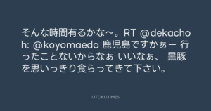 Koyo Maeda @koyomaeda – 9:00・2012年5月20日 2012 5/20 前田耕陽 2012-05-20 そんな時間有るかな〜。RT @dekachoh: @koyomaeda 鹿児島ですかぁー 行ったことないからなぁ いいなぁ、 黒豚を思いっきり食らってきて下さい。 Source:https://x.com/koyomaeda/status/203998563687071744 text X Post 前田耕陽 前田耕陽 この記事が気に入ったら フォローしてね! Follow @OtokoTimes1988 よかったらシェアしてね! URLをコピーしました! Koyo Maeda @koyomaeda - 8:32・2012年5月20日 Koyo Maeda @koyomaeda - 11:34・2012年5月20日 関連記事 Artist 前田耕陽 1968.08.16