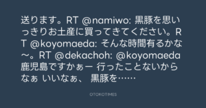 送ります。RT @namiwo: 黒豚を思いっきりお土産に買ってきてください。RT @koyomaeda: そんな時間有るかな〜。RT @dekachoh: @koyomaeda 鹿児島ですかぁー 行ったことないからなぁ いいなぁ、 黒豚を思いっきり食らってきて下さい。
