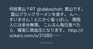 何故富山?RT @dekachoh: 富山です。 富山ブラックラーメンを食す。 んー、すいません!とにかく塩っぱい。 関西人には多分無理。 こんなん毎日食べたら、確実に高血圧になります。 http://lockerz.com/s/213801363 http://lockerz.com/s/213801375