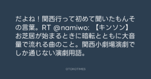 だよね!関西行って初めて聞いたもんその言葉。RT @namiwo: 【キンソン】お芝居が始まるときに暗転とともに大音量で流れる曲のこと。関西小劇場演劇でしか通じない演劇用語。