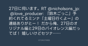 27日に伺います。RT @nicholsons_jp: @love_producer: 『鈴木ごっこ』予約くれてるミンナ「土曜日行くよー」の連絡ありがとー! だから俺、27日のオリジナル編と29日のバイオレンス編だってば! 嬉しいけどセツナイ感。 このセツナサを埋めてください。