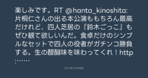 楽しみです。RT @hanta_kinoshita: 片桐仁さんの出る本公演ももちろん最高だけれど、四人芝居の『鈴木ごっこ』もぜひ観て欲しいんだ。食卓だけのシンプルなセットで四人の役者がガチンコ勝負する。生の醍醐味を味わってくれ!http://bit.ly/K8US1z