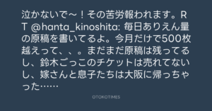 泣かないで〜!その苦労報われます。RT @hanta_kinoshita: 毎日ありえん量の原稿を書いてるよ。今月だけで500枚越えって、、。まだまだ原稿は残ってるし、鈴木ごっこのチケットは売れてないし、嫁さんと息子たちは大阪に帰っちゃったし、もう泣いちゃうよ、俺。(T_T)