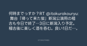何時までっすか?RT @itakurakouryu: 舞台「帰って来た蛍」新潟公演用の稽古も今日で終了…3日に新潟入り予定。稽古後に楽しく酒を呑む。良い1日だ…。
