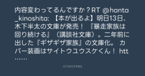 内容変わってるんですか?RT @hanta_kinoshita: 【本が出るよ】明日13日、木下半太の文庫が発売! 『暴走家族は回り続ける』(講談社文庫)。二年前に出した『ギザギザ家族』の文庫化。 カバー装画はサイトウユウスケくん! http://lockerz.com/s/224337481
