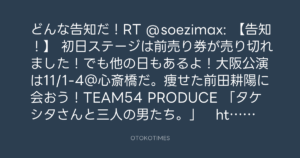 どんな告知だ!RT @soezimax: 【告知!】 初日ステージは前売り券が売り切れました!でも他の日もあるよ!大阪公演は11/1-4@心斎橋だ。痩せた前田耕陽に会おう!TEAM54 PRODUCE 「タケシタさんと三人の男たち。」 http://soezimax.com/headroom/team54
