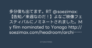 多分僕も出てます。RT @soezimax: 【告知/来週なのだ!】よなご映像フェスティバルにノミネートされました。My film nominated to Yonago http://soezimax.com/headroom/archives/3031