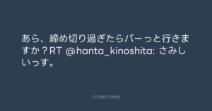 Koyo Maeda @koyomaeda – 23:15・2012年12月12日 2012 12/12 前田耕陽 2012-12-12 あら、締め切り過ぎたらパーっと行きますか?RT @hanta_kinoshita: さみしいっす。 Source:https://x.com/koyomaeda/status/278865566473801728 text X Post 前田耕陽 前田耕陽 この記事が気に入ったら フォローしてね! Follow @OtokoTimes1988 よかったらシェアしてね! URLをコピーしました! 寺岡 呼人 @yohitoteraoka - 09:16・2012年12月12日(IG post) 青山英樹 @aoyama_hideki - 11:21・2012年12月13日 関連記事 Artist 前田耕陽 1968.08.16