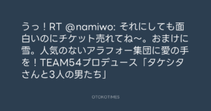 Koyo Maeda @koyomaeda – 10:38・2013年1月15日 2013 1/15 前田耕陽 2013-01-15 うっ!RT @namiwo: それにしても面白いのにチケット売れてね~。おまけに雪。人気のないアラフォー集団に愛の手を!TEAM54プロデュース「タケシタさんと3人の男たち」 Source:https://x.com/koyomaeda/status/290996326295015424 text X Post 前田耕陽 前田耕陽 この記事が気に入ったら フォローしてね! Follow @OtokoTimes1988 よかったらシェアしてね! URLをコピーしました! Koyo Maeda @koyomaeda - 10:33・2013年1月15日 Koyo Maeda @koyomaeda - 10:39・2013年1月15日 関連記事 Artist 前田耕陽 1968.08.16