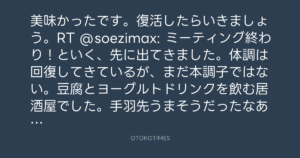 美味かったです。復活したらいきましょう。RT @soezimax: ミーティング終わり!といく、先に出てきました。体調は回復してきているが、まだ本調子ではない。豆腐とヨーグルトドリンクを飲む居酒屋でした。手羽先うまそうだったなあ…