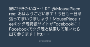 観に行きたいな〜!RT @MousePieceree: おはようございます!今日も一日頑張ってまいりましょう!MousePiece-reeのケタ魂特設サイトがFacebookに!Facebookでケタ魂と検索して頂いたら出て参ります!https://m.facebook.com/profile.php?id=44688425