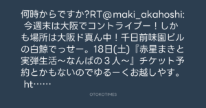 何時からですか?RT@maki_akahoshi: 今週末は大阪でコントライブー!しかも場所は大阪ド真ん中!千日前味園ビルの白鯨でっせー。18日(土)『赤星まきと実弾生活~なんばの3人~』チケット予約とかもないのでゆるーくお越しやす。 http://www.jitudan.net/