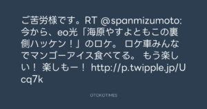 ご苦労様です。RT @spanmizumoto: 今から、eo光「海原やすよともこの裏側ハッケン!」のロケ。