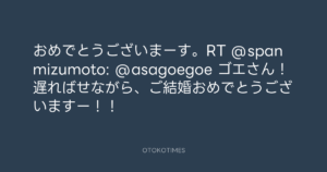 おめでとうございまーす。RT @spanmizumoto: @asagoegoe ゴエさん!遅ればせながら、ご結婚おめでとうございますー!!