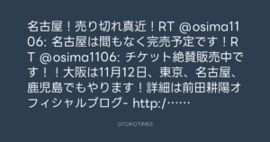 名古屋!売り切れ真近!RT @osima1106: 名古屋は間もなく完売予定です!RT @osima1106: チケット絶賛販売中です!!大阪は11月12日、東京、名古屋、鹿児島でもやります!詳細は前田耕陽オフィシャルブログ- http://s.ameblo.jp/k0y0maeda5o4o/entry-11631110601.html