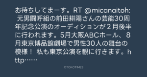 お待ちしてまーす。RT @micanaitoh: 元男闘呼組の前田耕陽さんの芸能30周年記念公演のオーディションが2月後半に行われます。5月大阪ABCホール、8月東京博品館劇場で男性30人の舞台の模様! 私も東京公演を観に行きます。https://www.facebook.com/Team54produce