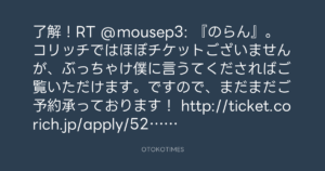 コリッチではほぼチケットございませんが、ぶっちゃけ僕に言うてくださればご覧いただけます。ですので、まだまだご予約承っております!
