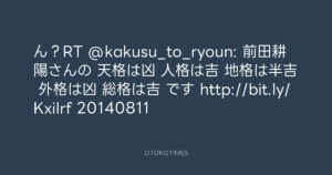 Koyo Maeda @koyomaeda – 20:43・2014年8月11日 2014 8/11 前田耕陽 2014-08-11 ん?RT @kakusu_to_ryoun: 前田耕陽さんの 天格は凶 人格は吉 地格は半吉 外格は凶 総格は吉 です http://bit.ly/KxiIrf 20140811 Source:https://x.com/koyomaeda/status/498796920504999937 text X Post 前田耕陽 前田耕陽 この記事が気に入ったら フォローしてね! Follow @OtokoTimes1988 よかったらシェアしてね! URLをコピーしました! Koyo Maeda @koyomaeda - 0:03・2014年8月11日 寺岡 呼人 @yohitoteraoka - 20:56・2014年8月11日(IG post) 関連記事 Artist 前田耕陽 1968.08.16