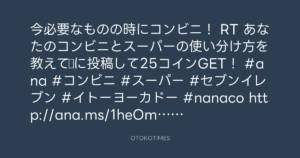 今必要なものの時にコンビニ! RT あなたのコンビニとスーパーの使い分け方を教えて♪に投稿して25コインGET! #ana #コンビニ #スーパー #セブンイレブン #イトーヨーカドー #nanaco http://ana.ms/1heOmi9