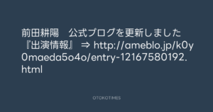 Koyo Maeda @koyomaeda – 14:27・2016年6月5日 2016 6/05 前田耕陽 2016-06-05 前田耕陽 公式ブログを更新しました 『出演情報』 ⇒ http://ameblo.jp/k0y0maeda5o4o/entry-12167580192.html Source:https://x.com/koyomaeda/status/739327831490973697 text X Post 前田耕陽 前田耕陽 この記事が気に入ったら フォローしてね! Follow @OtokoTimes1988 よかったらシェアしてね! URLをコピーしました! 寺岡 呼人 @yohitoteraoka - 23:04・2016年6月1日(IG post) Koyo Maeda @koyomaeda - 15:11・2016年6月5日 関連記事 Artist 前田耕陽 1968.08.16