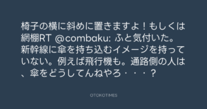 Koyo Maeda @koyomaeda – 10:08・2016年7月8日 2016 7/08 前田耕陽 2016-07-08 椅子の横に斜めに置きますよ!もしくは網棚RT @combaku: ふと気付いた。新幹線に傘を持ち込むイメージを持っていない。例えば飛行機も。通路側の人は、傘をどうしてんねやろ・・・? Source:https://x.com/koyomaeda/status/751221475391119362 text X Post 前田耕陽 前田耕陽 この記事が気に入ったら フォローしてね! Follow @OtokoTimes1988 よかったらシェアしてね! URLをコピーしました! 寺岡呼人 @yohito_teraoka - 0:49・2016年7月8日 Koyo Maeda @koyomaeda - 20:49・2016年7月8日 関連記事 Artist 前田耕陽 1968.08.16