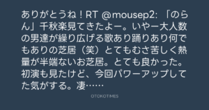 ありがとうね!RT @mousep2: 「のらん」千秋楽見てきたよー。いやー大人数の男達が繰り広げる歌あり踊りあり何でもありの芝居(笑)とてもむさ苦しく熱量が半端ないお芝居。とても良かった。初演も見たけど、今回パワーアップしてた気がする。凄い刺激を貰いました。観れて良かった。