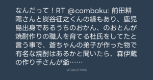 なんだって!RT @combaku: 前田耕陽さんと炭谷征之くんの縁もあり、鹿児島出身であるうちのおかん、のおとんが焼酎作りの職人を育てる杜氏をしてたと言う事で、爺ちゃんの弟子が作った物で有名な焼酎はあるかと聞いたら、森伊蔵の作り手さんが爺ちゃんの弟子だと聞いて興奮が冷めやらぬ。
