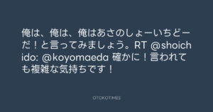 Koyo Maeda @koyomaeda – 22:48・2016年12月7日 2016 12/07 前田耕陽 2016-12-07 俺は、俺は、俺はあさのしょーいちどーだ!と言ってみましょう。RT @shoichido: @koyomaeda 確かに!言われても複雑な気持ちです! Source:https://x.com/koyomaeda/status/806495696278802432 text X Post 前田耕陽 前田耕陽 この記事が気に入ったら フォローしてね! Follow @OtokoTimes1988 よかったらシェアしてね! URLをコピーしました! Koyo Maeda @koyomaeda - 22:47・2016年12月7日 Koyo Maeda @koyomaeda - 22:50・2016年12月7日 関連記事 Artist 前田耕陽 1968.08.16