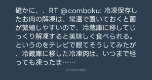 確かに、、RT @combaku: 冷凍保存したお肉の解凍は、常温で置いておくと菌が繁殖しやすいので、冷蔵庫に移してじっくり解凍すると美味しく食べられる。というのをテレビで観てそうしてみたが、冷蔵庫に移した冷凍肉は、いつまで経っても凍ったままやないか!