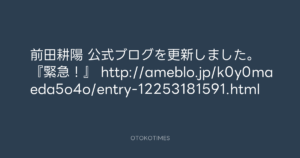 Koyo Maeda @koyomaeda – 10:13・2017年3月4日 2017 3/04 前田耕陽 2017-03-04 前田耕陽 公式ブログを更新しました。 『緊急!』 http://ameblo.jp/k0y0maeda5o4o/entry-12253181591.html Source:https://x.com/koyomaeda/status/837833343500603394 text X Post 前田耕陽 前田耕陽 この記事が気に入ったら フォローしてね! Follow @OtokoTimes1988 よかったらシェアしてね! URLをコピーしました! Koyo Maeda @koyomaeda - 8:00・2017年3月4日 Koyo Maeda @koyomaeda - 11:58・2017年3月4日 関連記事 Artist 前田耕陽 1968.08.16