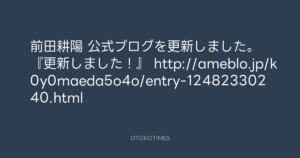 Koyo Maeda @koyomaeda – 22:55・2019年6月17日 2019 6/17 前田耕陽 2019-06-17 前田耕陽 公式ブログを更新しました。 『更新しました!』 http://ameblo.jp/k0y0maeda5o4o/entry-12482330240.html Source:https://x.com/koyomaeda/status/1140618874842316801 text X Post 前田耕陽 前田耕陽 この記事が気に入ったら フォローしてね! Follow @OtokoTimes1988 よかったらシェアしてね! URLをコピーしました! Koyo Maeda @koyomaeda - 22:51・2019年6月17日 Koyo Maeda @koyomaeda - 14:04・2019年6月18日 関連記事 Artist 前田耕陽 1968.08.16