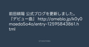 Koyo Maeda @koyomaeda – 18:40・2020年5月9日 2020 5/09 前田耕陽 2020-05-09 前田耕陽 公式ブログを更新しました。 『デビュー曲』 http://ameblo.jp/k0y0maeda5o4o/entry-12595843861.html Source:https://x.com/koyomaeda/status/1259055729366843392 text X Post 前田耕陽 前田耕陽 この記事が気に入ったら フォローしてね! Follow @OtokoTimes1988 よかったらシェアしてね! URLをコピーしました! Koyo Maeda @koyomaeda - 18:40・2020年5月9日 青山英樹 @aoyama_hideki - 18:45・2020年5月10日 関連記事 Artist 前田耕陽 1968.08.16