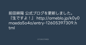 Koyo Maeda @koyomaeda – 20:16・2020年6月19日 2020 6/19 前田耕陽 2020-06-19 前田耕陽 公式ブログを更新しました。 『生ですよ!』 http://ameblo.jp/k0y0maeda5o4o/entry-12605397309.html Source:https://x.com/koyomaeda/status/1273937596930908160 text X Post 前田耕陽 前田耕陽 この記事が気に入ったら フォローしてね! Follow @OtokoTimes1988 よかったらシェアしてね! URLをコピーしました! Koyo Maeda @koyomaeda - 20:13・2020年6月19日 寺岡呼人 @yohito_teraoka - 14:59・2020年6月20日 関連記事 Artist 前田耕陽 1968.08.16