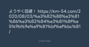 ようやく回避! https://km-54.com/2020/08/03/%e3%82%88%e3%81%86%e3%82%84%e3%81%8f%e5%9b%9e%e9%81%bf%ef%bc%81/