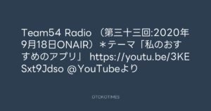Team54 Radio (第三十三回:2020年9月18日ONAIR)*テーマ「私のおすすめのアプリ」 https://youtu.be/3KESxt9Jdso @YouTubeより