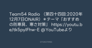 Team54 Radio (第四十四回:2020年12月7日ONAIR)*テーマ「おすすめの防寒具、寒さ対策」 https://youtu.be/tk5pyIFhw-E @YouTubeより